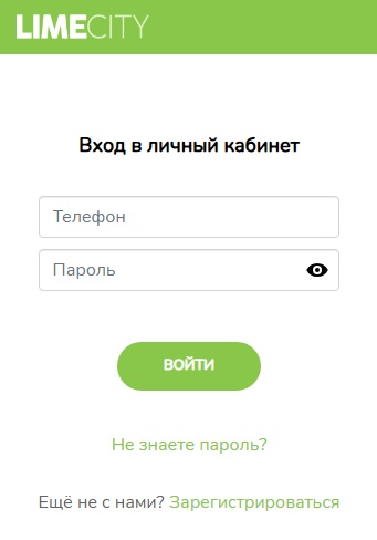 Введите логин (номер телефона) и пароль от кабинета LIMECITY и нажмите "Войти".