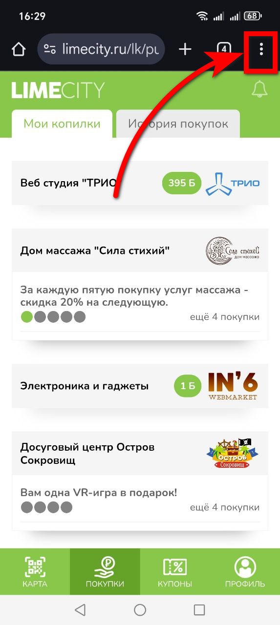 Войдите в ваш кабинет. Нажмите на точки меню вверху экрана.