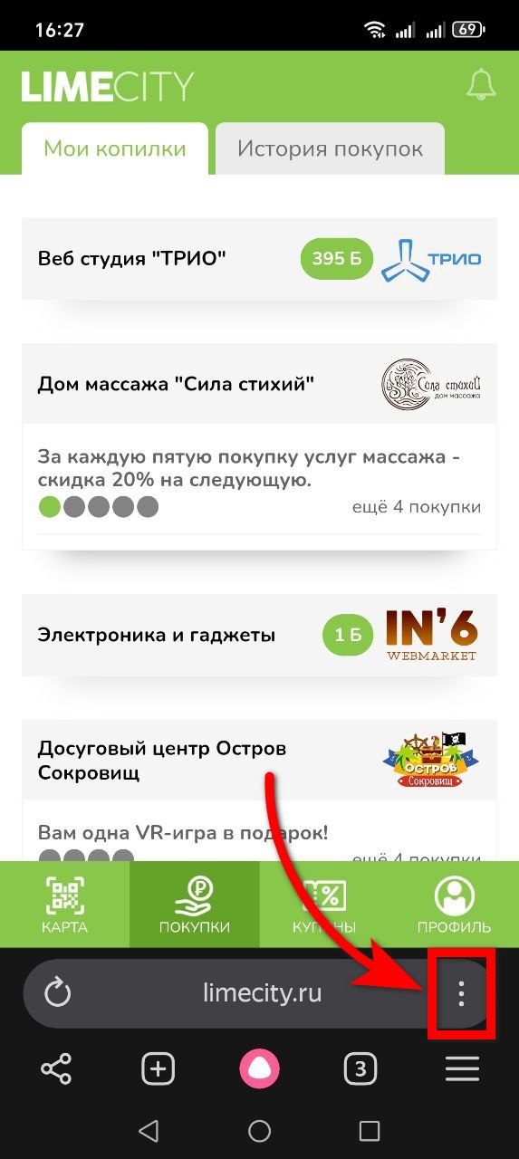 Войдите в ваш кабинет. Нажмите на точки меню внизу экрана.